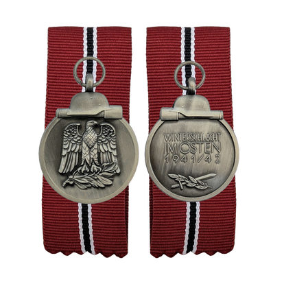 Diese originalgetreu gestaltete Reproduktion zeigt die sogenannte Ostmedaille – offiziell „Medaille Winterschlacht im Osten 1941/42“ – in der überarbeiteten Fassung von 1957. Verliehen wurde die Auszeichnung jenen Soldaten, die unter härtesten klimatischen Bedingungen am Winterfeldzug an der Ostfront teilnahmen.