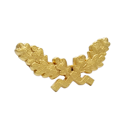 Die matt-goldene Bandauflage ist 33 mm breit, 15 mm hoch und zeigt zwei diagonal gekreuzte Eichenlaubblätter, welche in hoher Detailgenauigkeit dargestellt sind. Auf der Rückseite ist mittig ein zweteiliger Splint angelötet, der im Gegensatz zum äußerst bruchempfindlichen Original, in dieser Ausführung für ausreichend Stabilität und Langlebigkeit sorgt