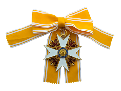 Das Ordenszeichen wurde an einer hellblauen Schärpe mit goldenen Seitenstreifen getragen, welche bei diesem Angebot durch eine entsprechende Schleife dargestellt wird.